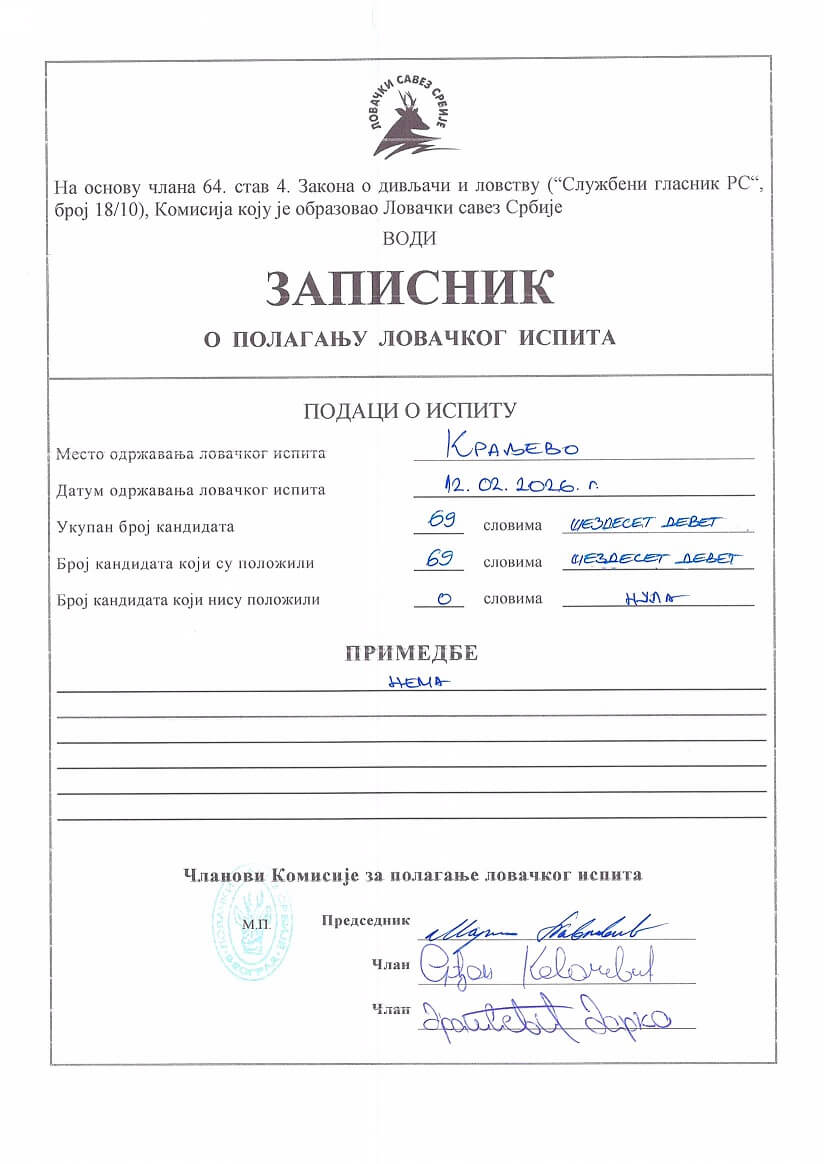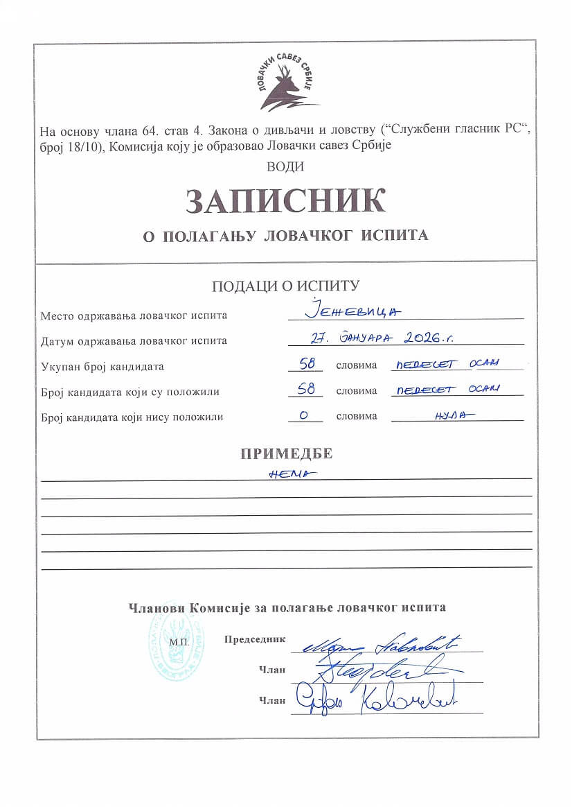 Међу датим подацима, поред осталог, посебну пажњу привлачи извештај о полагању ловачких испита у 2025. години, где се види да је ловачки испит организован за 1.037 кандидата од којих је 987 из ЛСЦС.