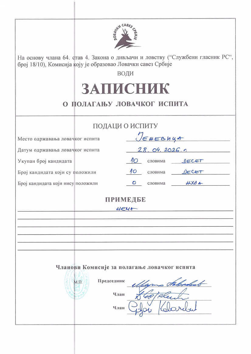 Na ispit je potrebno poneti lični dokument na uvid, dokaz o završenoj obuci u rukovanju vatrenim oružjem (fotokopiju ovog dokumenta zadržava organizator lovačkog ispita), hemijsku olovku (s obzirom da se lovački ispit polaže pismeno)!