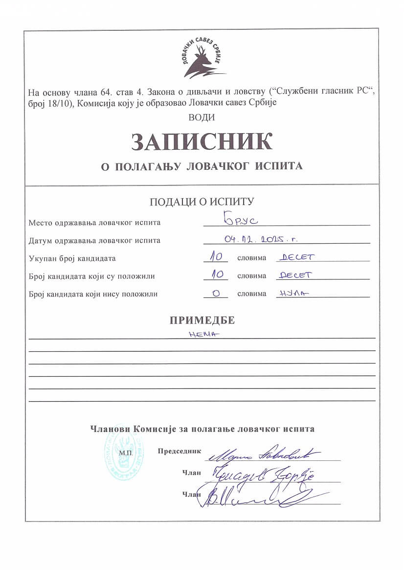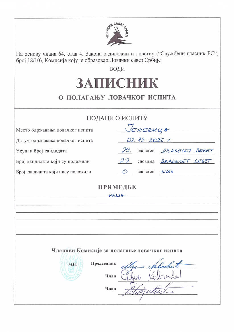 Међу датим подацима, поред осталог, посебну пажњу привлачи извештај о полагању ловачких испита у 2025. години, где се види да је ловачки испит организован за 1.037 кандидата од којих је 987 из ЛСЦС.