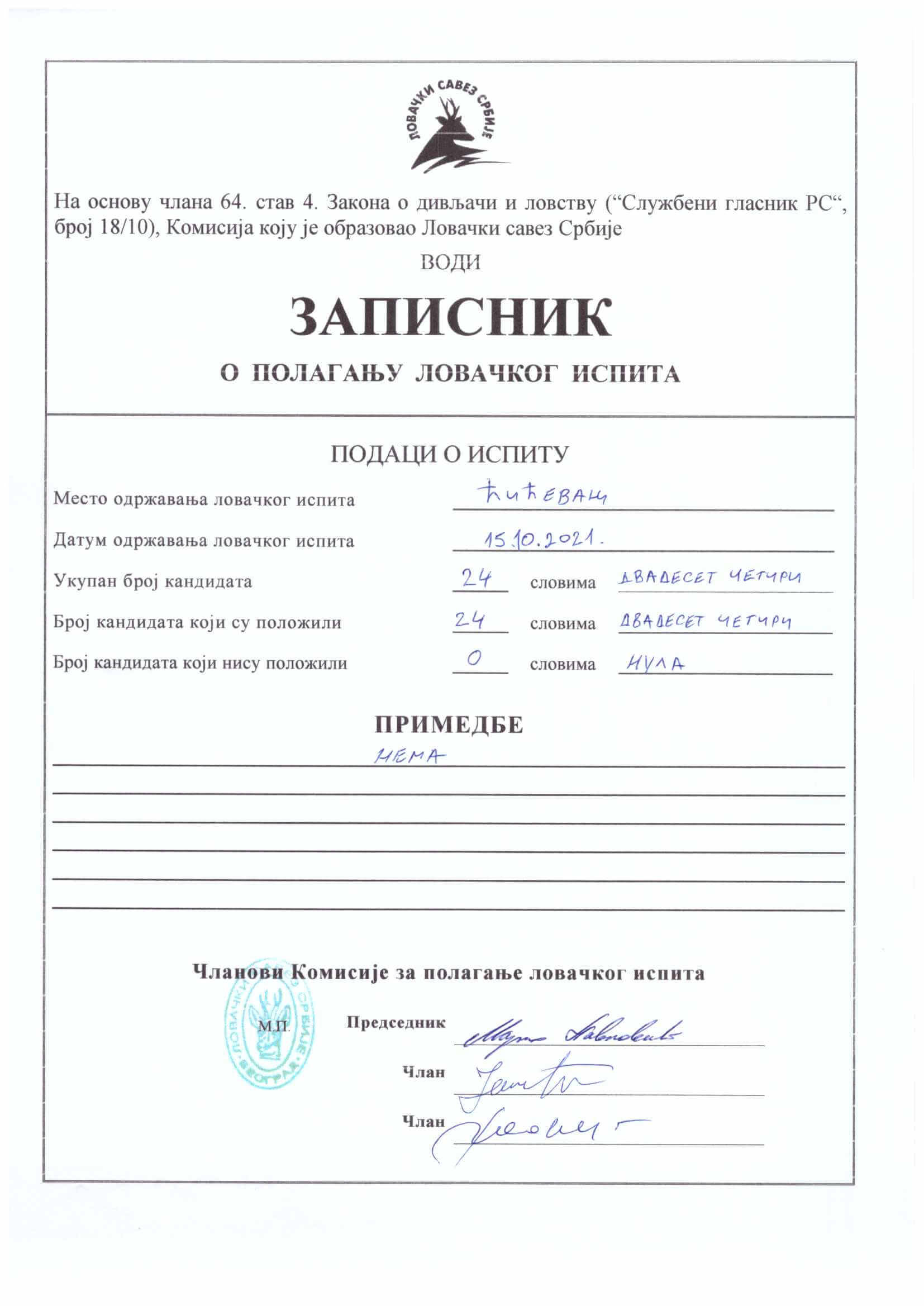 15.10.2021. godine održano je polaganje lovačkog ispita u Ćićevcu.