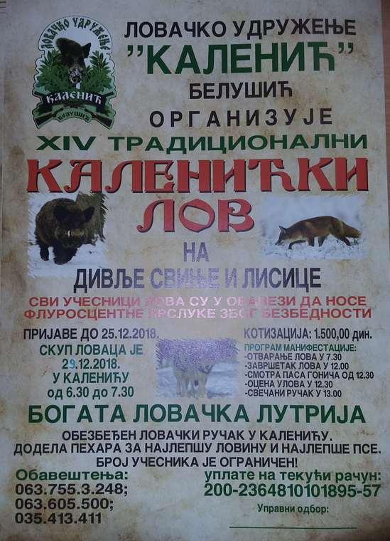 Једна од традиционалних ловчких манифестација, која се организује, крајем сваке године, и увек привлачи значајну пажњу јавности, уз учешће око 300 ловаца, је надалеко познати „Каленићки лов“ на дивље свиње и предаторе, у организацији ЛУ „Каленић“ из Белушића.