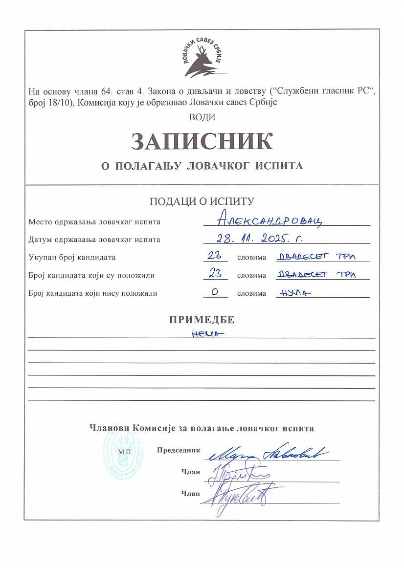 Ловачки савез Централне Србије - ЛСЦС - Новости: Održano je plaganje lovačkog ispita u Aleksandrovcu 28.11.2025. godine